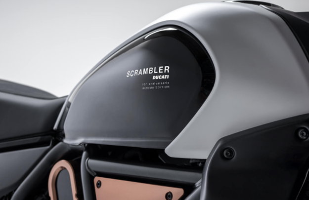 The captivating “Metal Rose” finish, paired with bold white fairings and a solid black base, makes the 10° Anniversario Rizoma Edition a true standout.