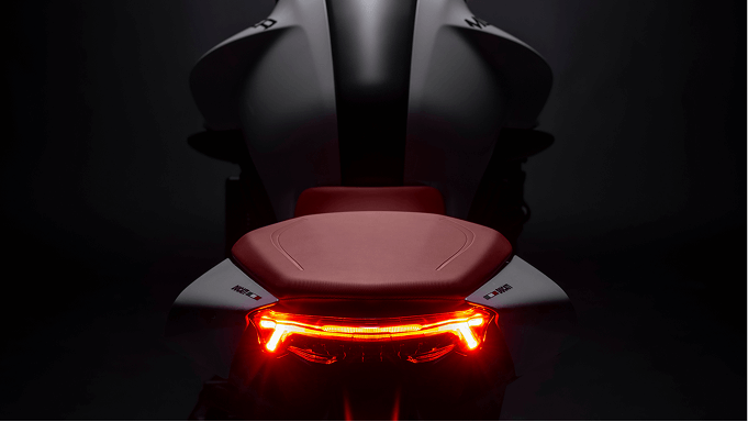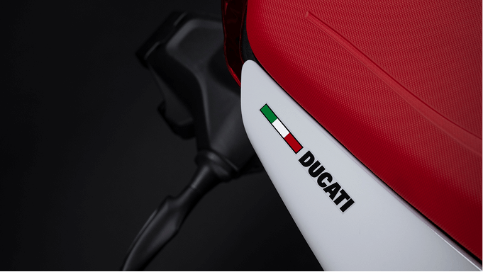 The view from above highlights its sinewy shapes. The seat, narrow in the arch, feeds into the powerful tank and extends, towards the rear, to meet with the volume of the sporty side fairings.