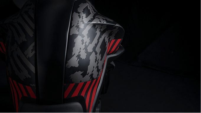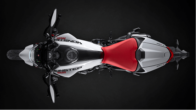 The view from above highlights its sinewy shapes. The seat, narrow in the arch, feeds into the powerful tank and extends, towards the rear, to meet with the volume of the sporty side fairings.