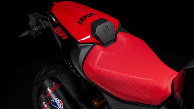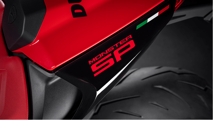 The red-colored seat complements the side view of the tail with the Monster SP logo and the Italian flag on the passenger seat cover.
