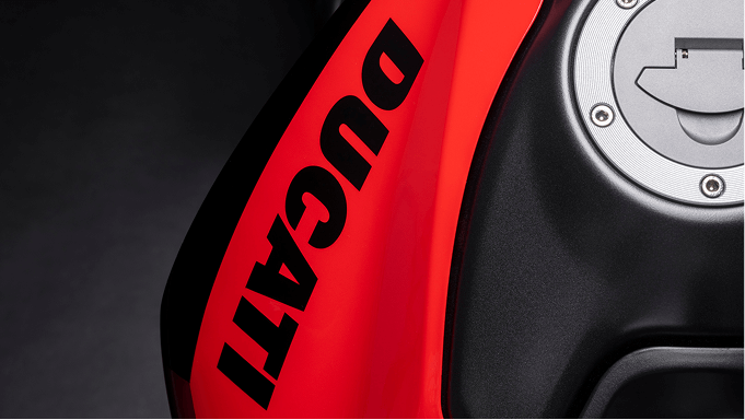 The Ducati lettering on the tank is reminiscent of the graphics on the Panigale V4.