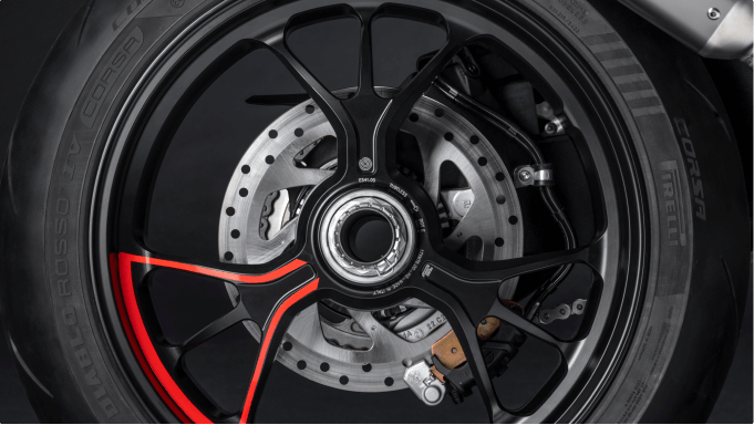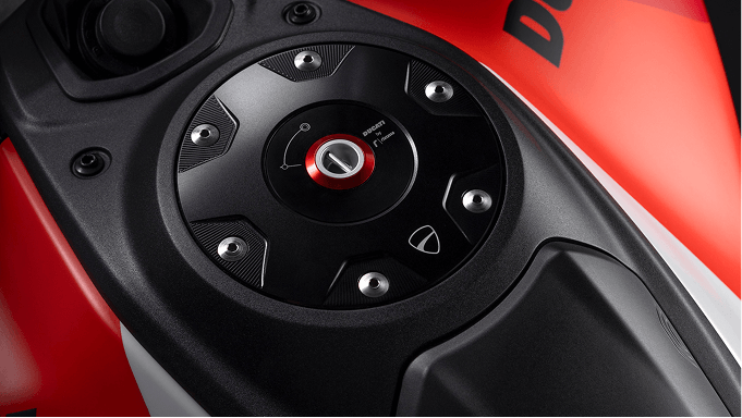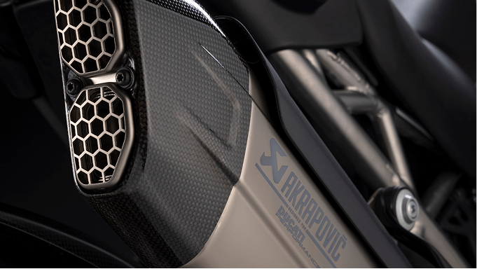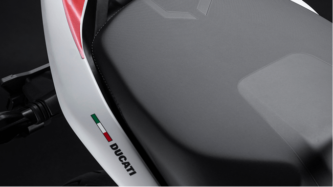 Carbon fiber components such as the front fender, hand guards, heat shield and front “beak” create contrasts with the Iceberg White livery, enhanced with references to the color scheme of the Desmosedici MotoGP.