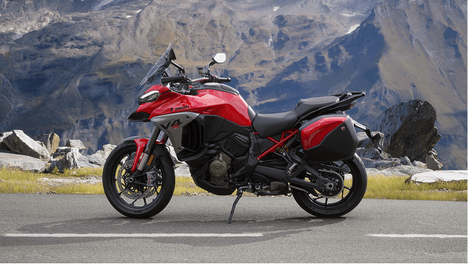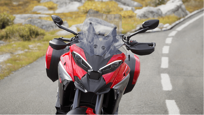 The Multistrada V4 S Travel & Radar exudes a purposeful aesthetic, featuring an innovative seven-spoke design for its new forged wheels, sized 19’’ front and 17’’ rear. These lightweight, sporty wheels contribute a 2kg weight saving, enhancing agility and precision. Pirelli SCORPION™ Trail II tyres ensure excellent performance across diverse terrains.