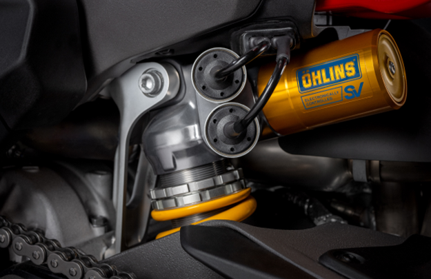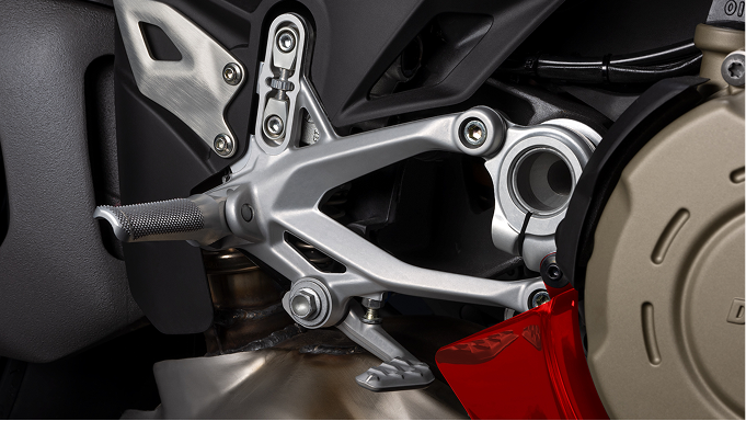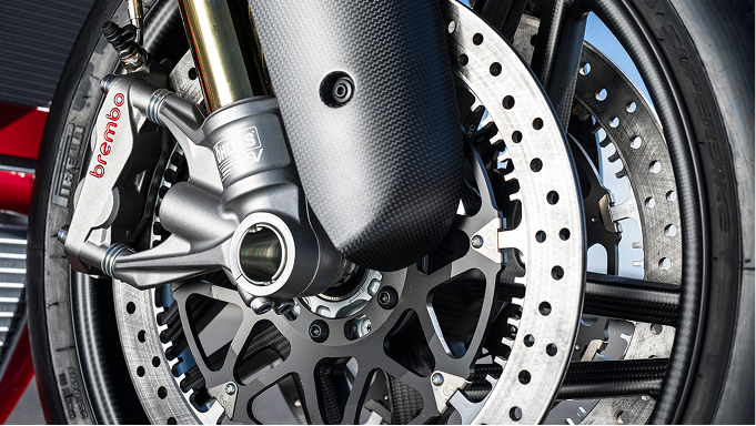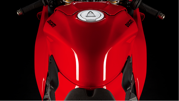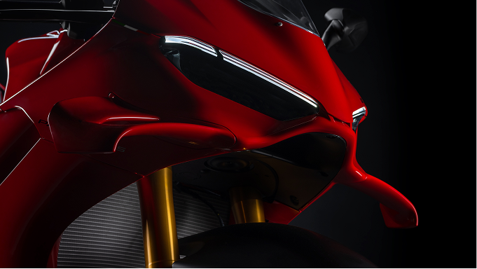 The aerodynamic approach is revolutionised with this motorcycle. The new Panigale V4 develops the concept of aerodynamic integration, seamlessly merging the various surfaces serving style and aerodynamics. Designers worked side by side with Ducati Corse technicians responsible for the aerodynamics of the Desmosedici GP to create the surfaces of the side and front fairings complete with integrated aerodynamic appendages. The side view stands out for the shape of the very high front wheel arch, in line with the current MotoGP philosophy.