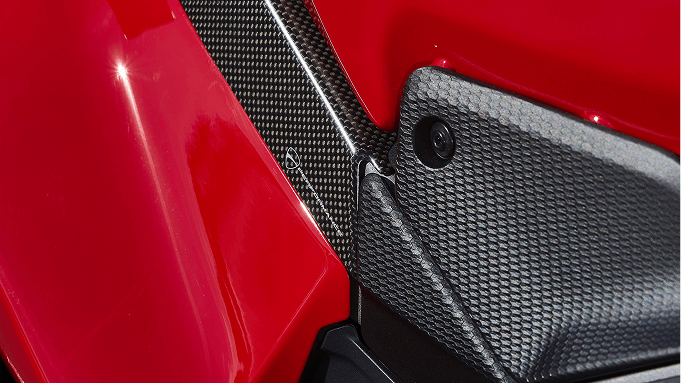 The new tank design retains the racing aesthetic with a section extending beneath the seat. The shape, fit and side pads serve to support the rider in all riding phases, helping them to assume an aerodynamic position along the straight and anchoring them both during braking and mid-turn when hanging off the bike.