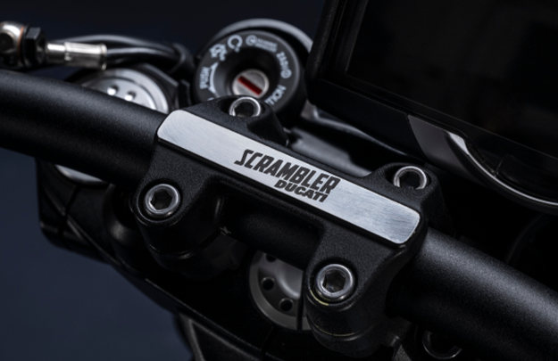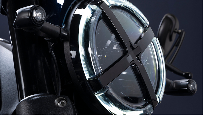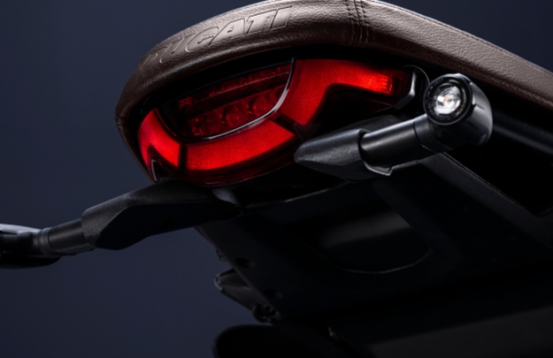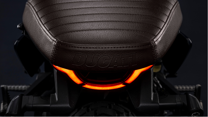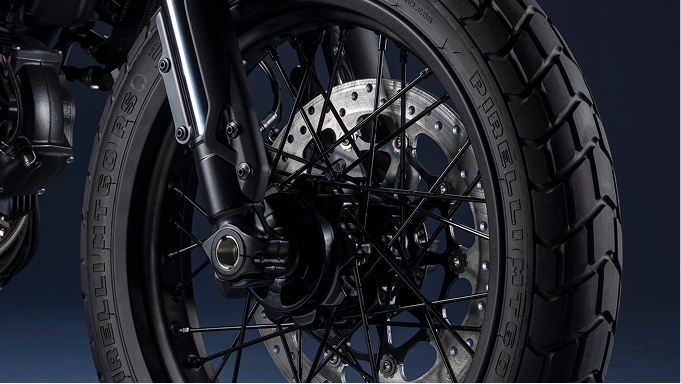 Featured by side number plates, the truncated front fender, the absence of the sporty front fender, the the full-black spoked wheels as well as the minimal LED indicators.