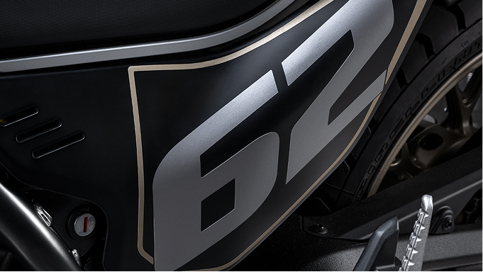 Inspired by flat track racing, the Full Throttle exudes street attitude with its black and bronze livery, bold side number plates, and low variable cross-section handlebar.