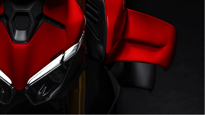 Double profile like those of the new Panigale V4 and better integrated into the front end, the upper wings help increasing the vertical load (+17 kg at 270km/h) and reinforce the family feeling.